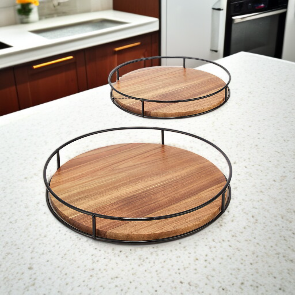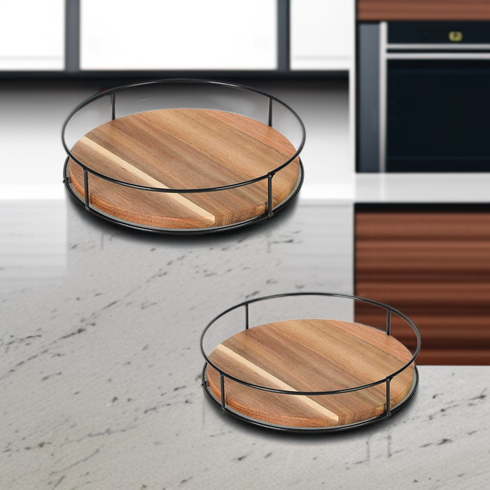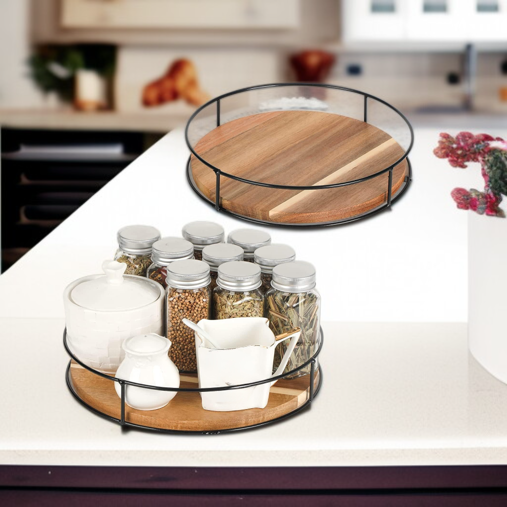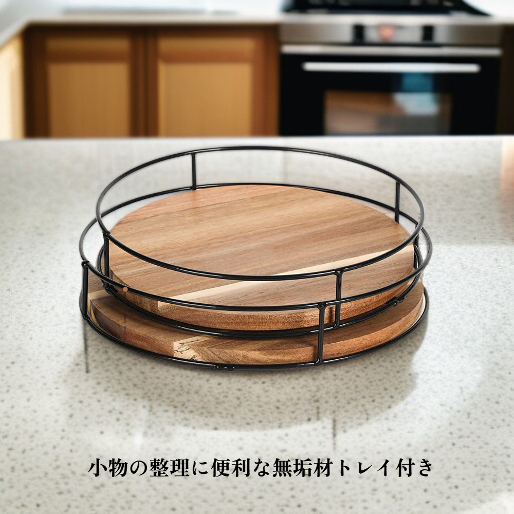 アカシア木製スーザン収納ラック・スチール製サイド雑貨整理ラック・回転式卓上キャビネット・実木トレイ
